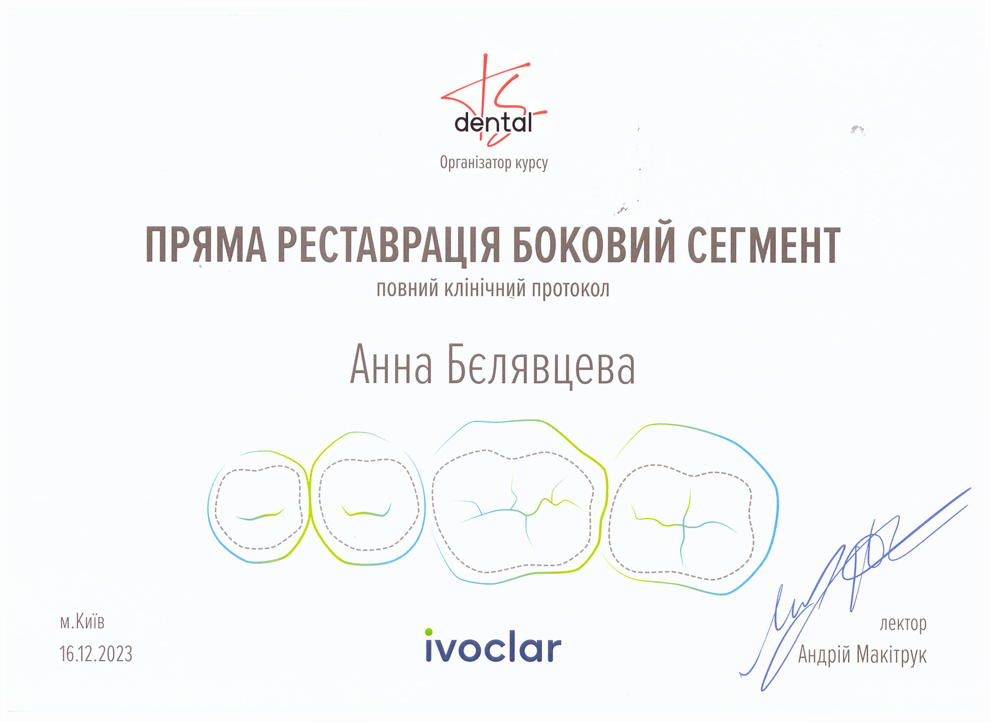 Має понад 20 сертифікатів з сучасних методик лікування та естетичної реставрації.
